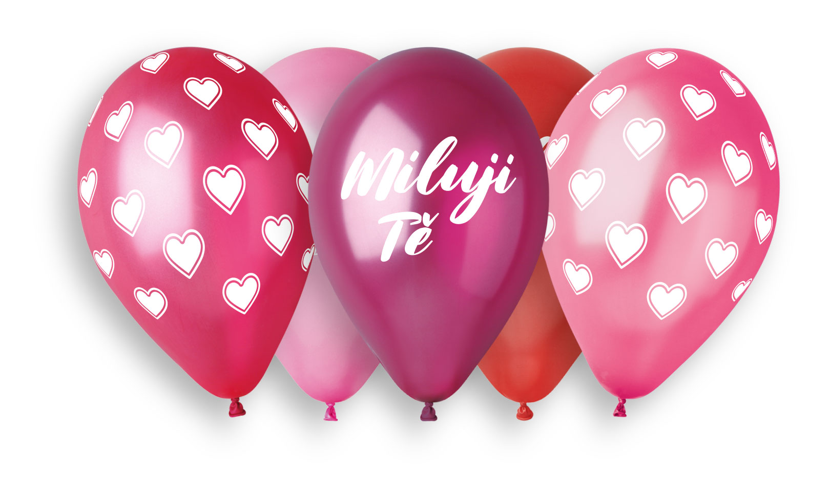 Nafukovací balónky s potiskem srdíček a Miluji Tě dodáváme v mixu barev.