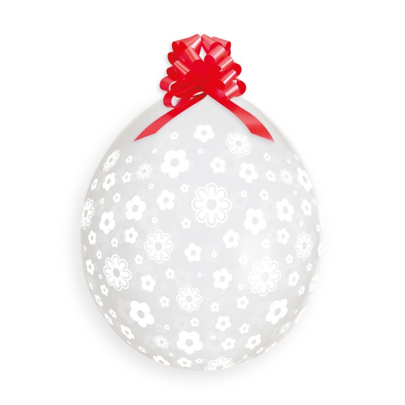 Balónky pro originální balení dárků jsou po nafouknutí průhledné (bezbarvé) s bílým potiskem květin.