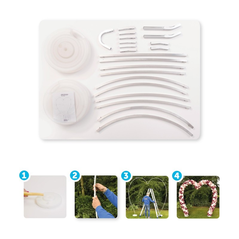 Sada obsahuje podstavec, spoje a tyče. Vše lze opakovaně použít. Přiložen návod na postavení stojanu i na dekorování balónků.