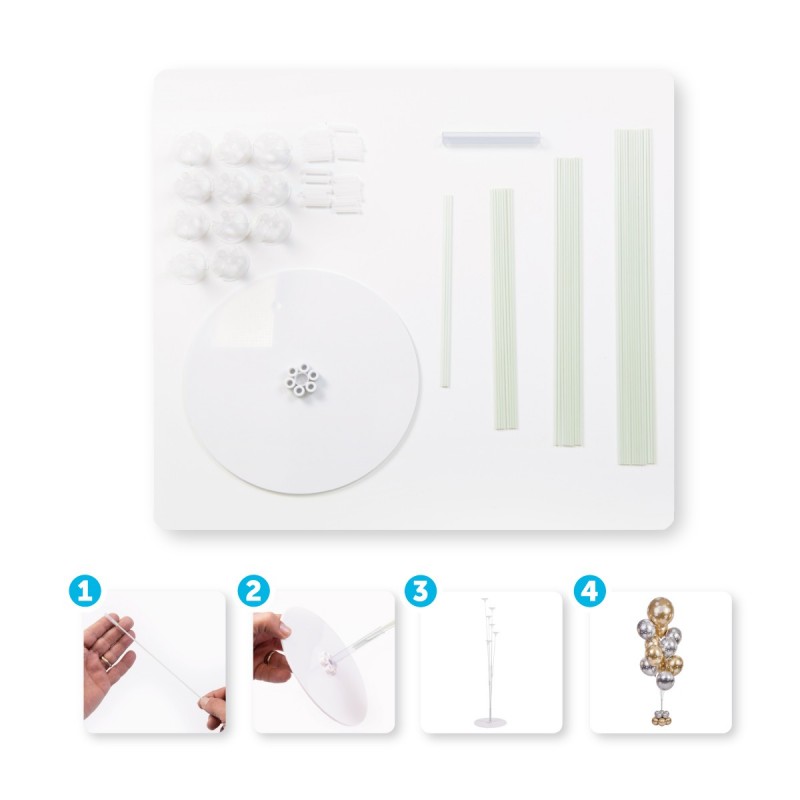Sada obsahuje podstavec, spoje, tyče a držáky na vrchní balónky. Vše lze opakovaně použít. Přiložen návod na postavení stojanu i na dekorování balónků.