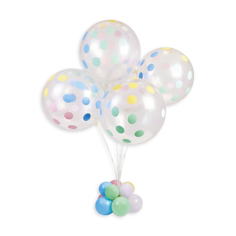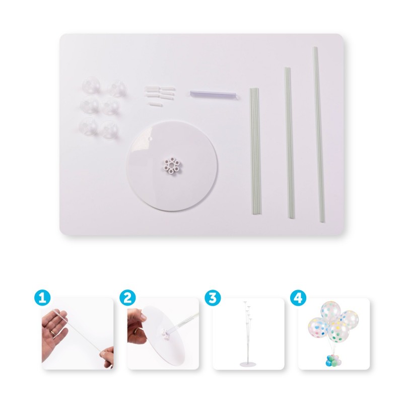 Sada obsahuje podstavec, spoje, tyče a držáky na vrchní balónky. Vše lze opakovaně použít. Přiložen návod na postavení stojanu i na dekorování balónků.