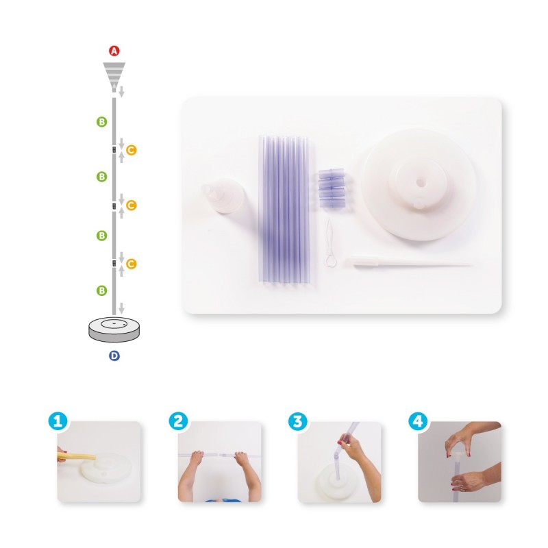 Sada obsahuje podstavec, tři spoje, čtyři tyče a jeden držák na vrchní balón. Vše lze opakovaně použít. Přiložen návod na postavení stojanu i na dekorování balónků.