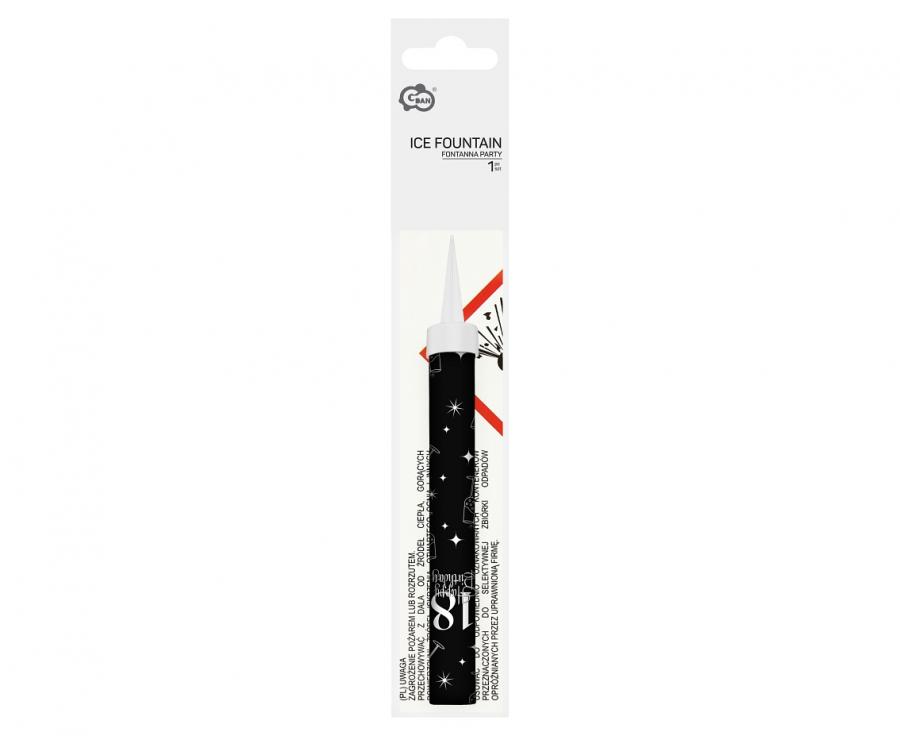 Fontána má ochraný plastový hrot. Pro bezpečné použití zabodněte fontánu hrotem do dortu, na opačném konci zapalte a ihned se vzdalte alespoň na 1m.