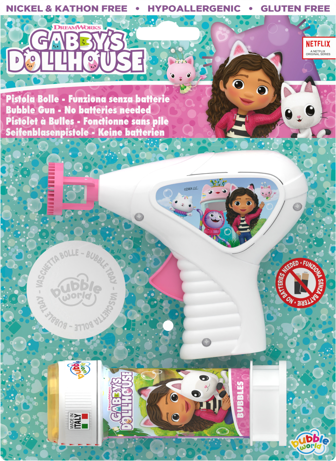 Balení obsahuje 60ml bublifuk, bublifukovou pistol a nádobu na bublifukovou tekutinu.
