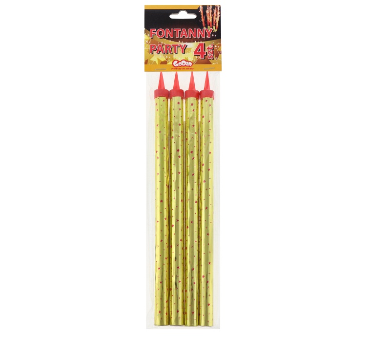 Fontána má ochraný plastový hrot. Pro bezpečné použití zabodněte fontánu hrotem do dortu, na opačném konci zapalte a ihned se vzdalte alespoň na 1m.