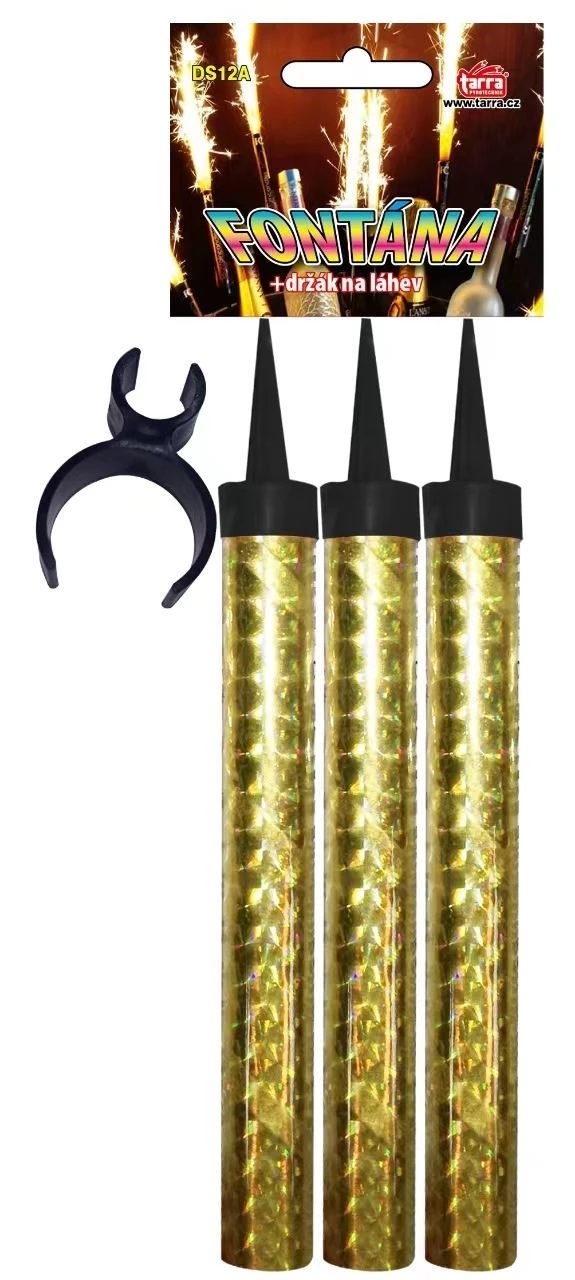 Jedno balení obsahuje 3 kusy vnitřní zlaté párty fontány o délce 12 cm s držákem na láhev.