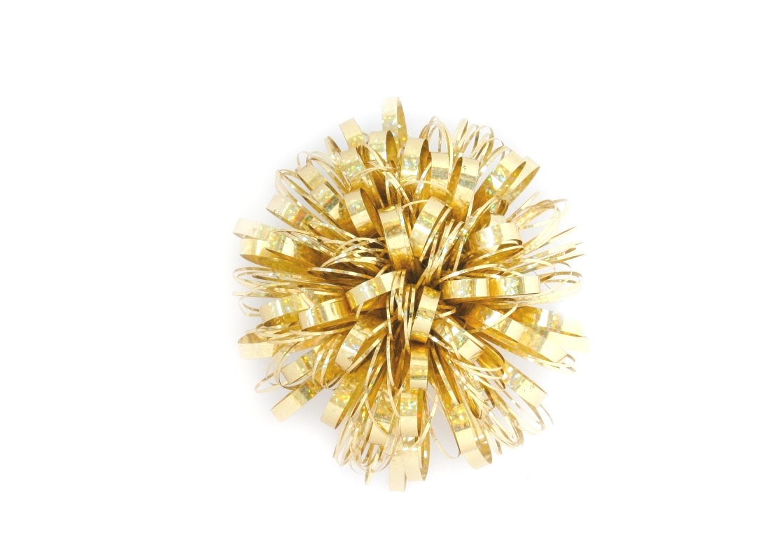 Ozdobná, bohatá, papírová rozeta, kterou upevníme jako ozdobu na dárky v barvě zlaté.