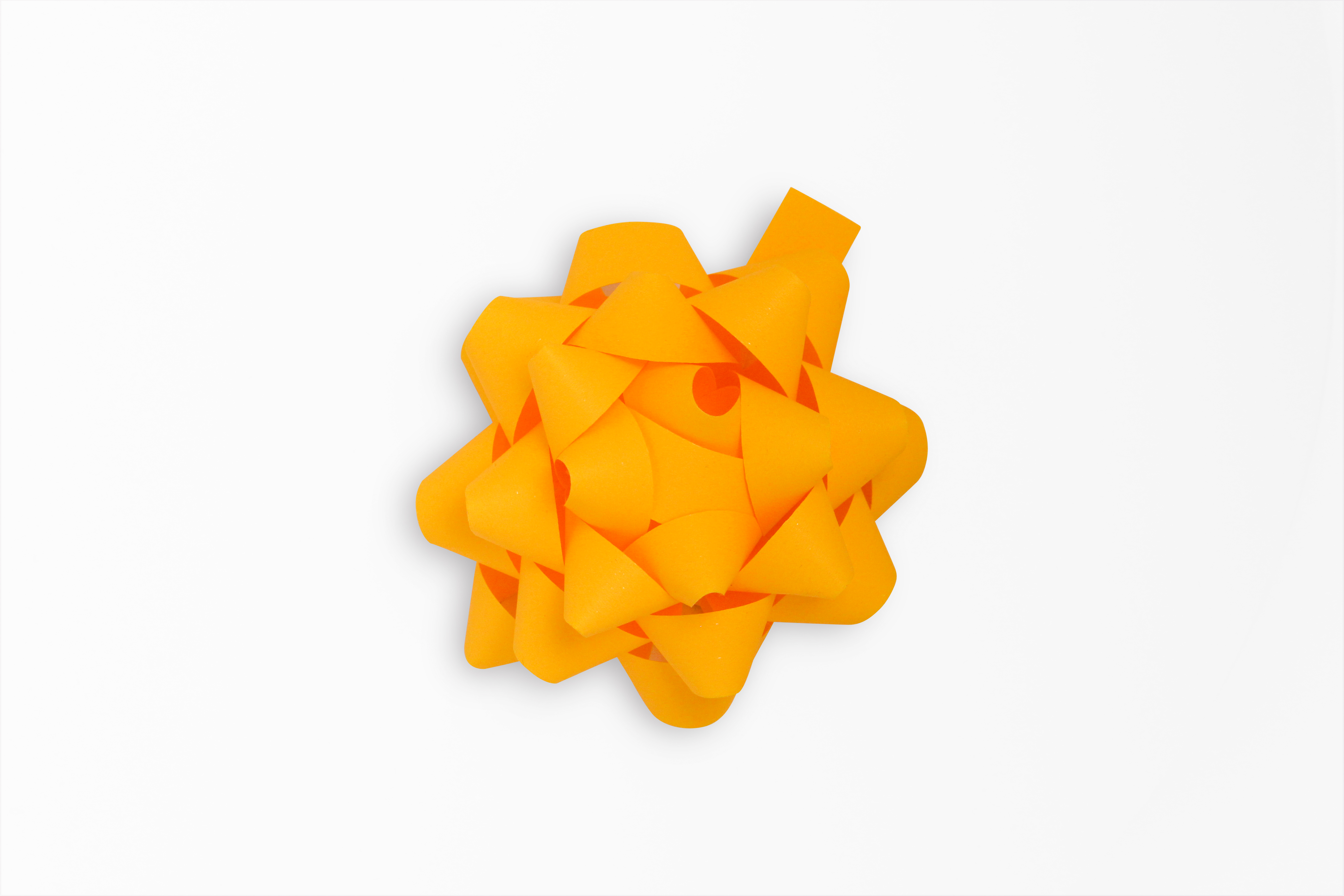 Ozdobná papírová rozeta na dárky v barvě žluté.