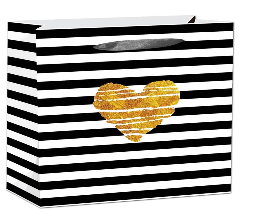 Kvalitní, papírová, dárková taška s motivem pruhů se zlatým srdcem.