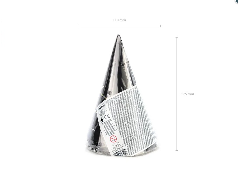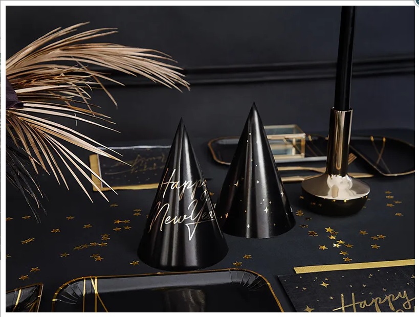 Balení šesti papírových párty čepiček v černé barvě se zlatými nápisem Happy New Year a hvězdami.
