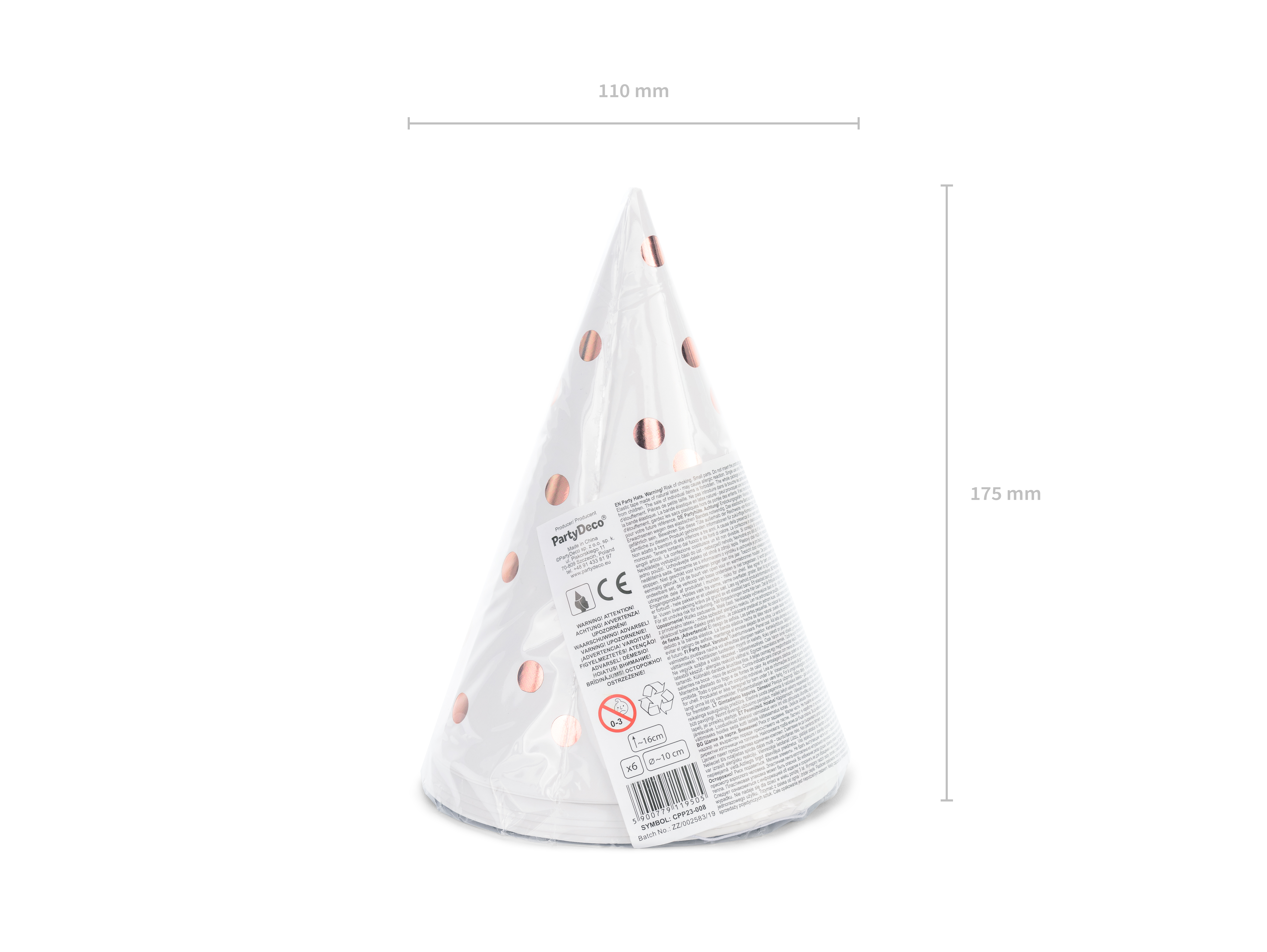 Papírové čepičky v bílé barvě s rosegold tečkami.