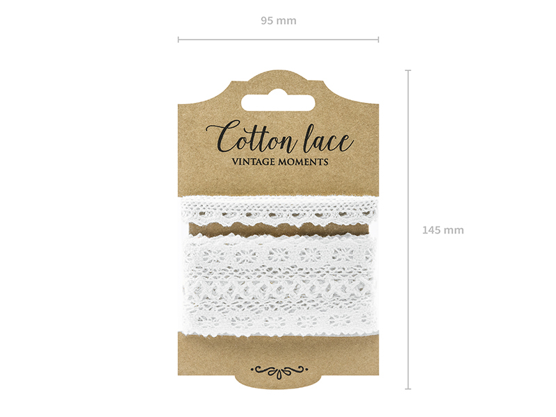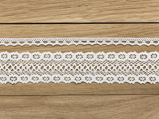 Bavlněná dekorativní krajka v bílé barvě, 2 různé designy o šířce 1cm a 4,5cm, každá krajka je asi 1.5 metru dlouhá.