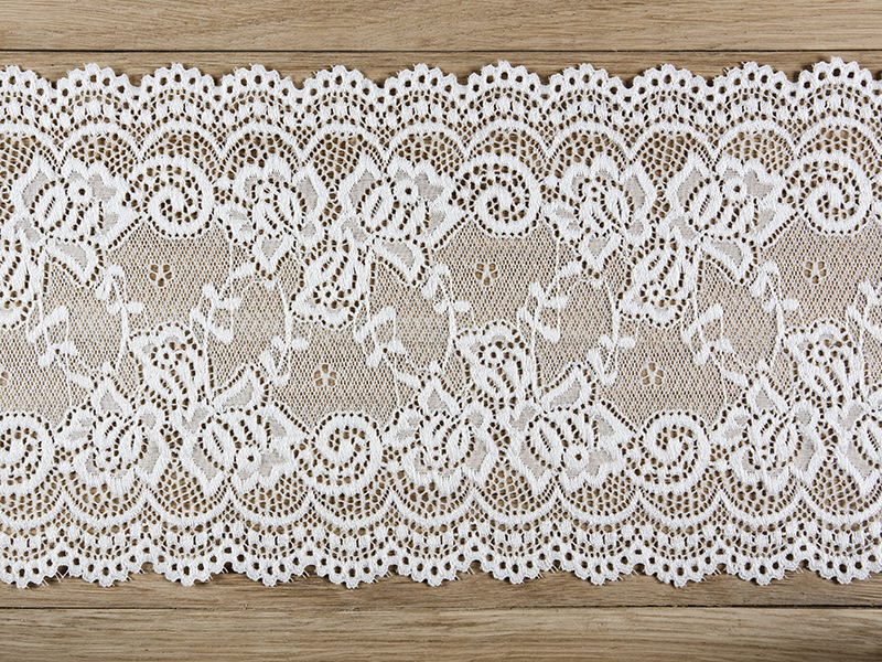 Bělavá dekorativní krajka o šířce cca 15cm, délka cca 9 metrů.