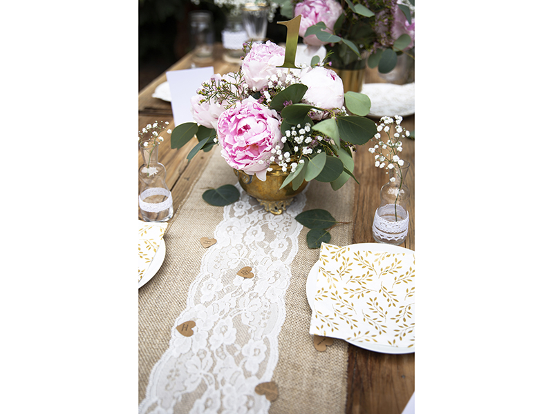 Jutový dekorační přehoz s krajkou, vhodný pro odekorování stolu v přírodním stylu.
