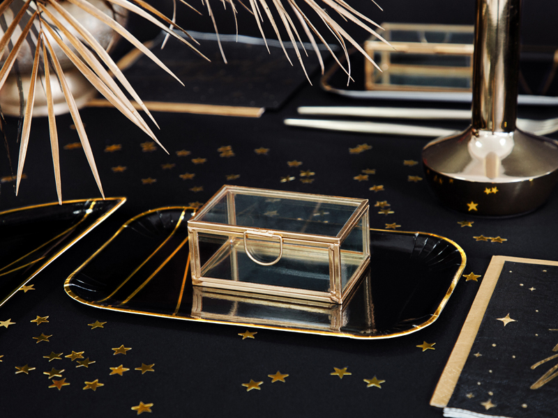 Skleněná krabička na prsteny se zlatými hranami, velikost je cca 9x5.5x4cm.