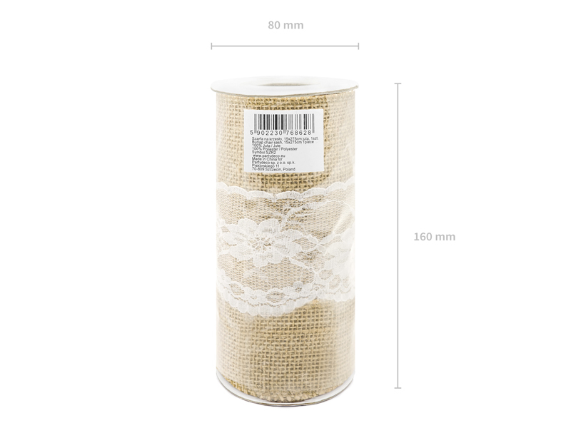 Pytlovinová šerpa na ozdobu židle s krajkou, šířka cca 15cm, délka cca 2,75m.