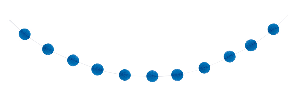 Papírová girlanda s modrými papírovými koulemi na provázku, délka girlandy je 2.13m.