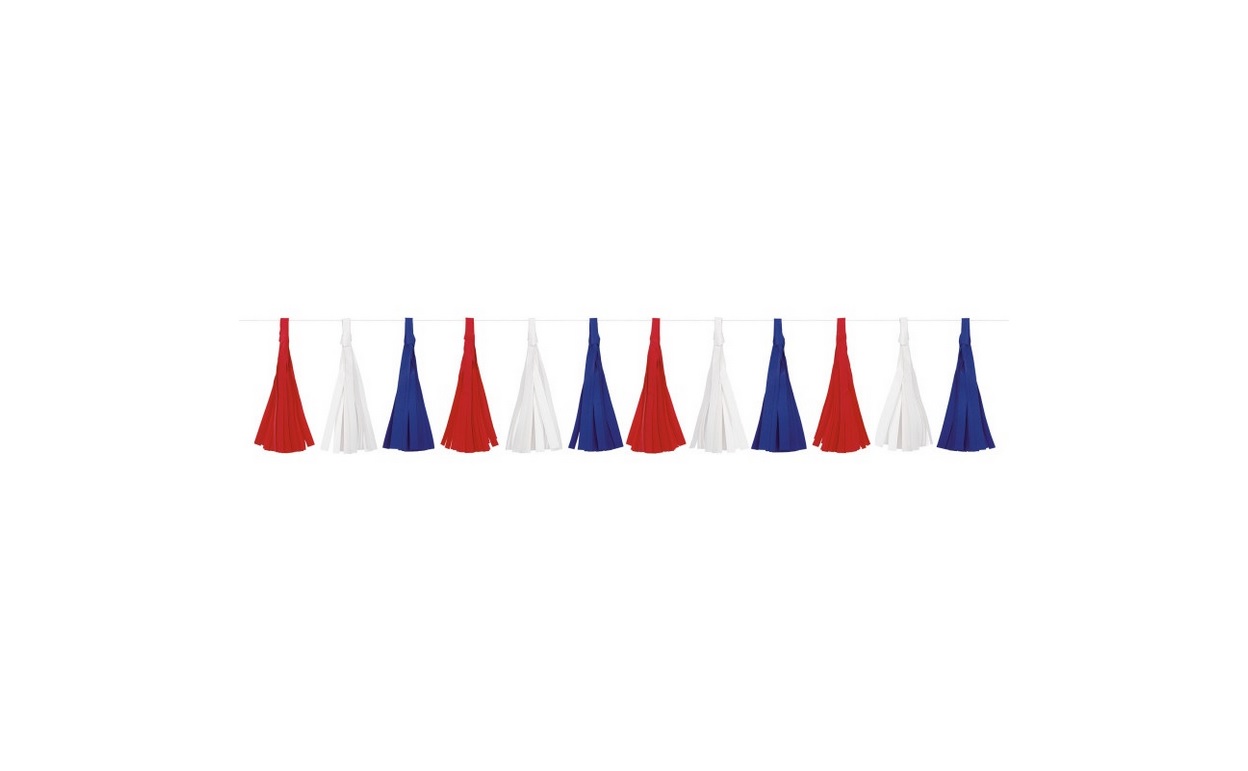 Střapcová girlanda v červené, bílé a modré barvě, střapce je možné libovolně posunovat.
