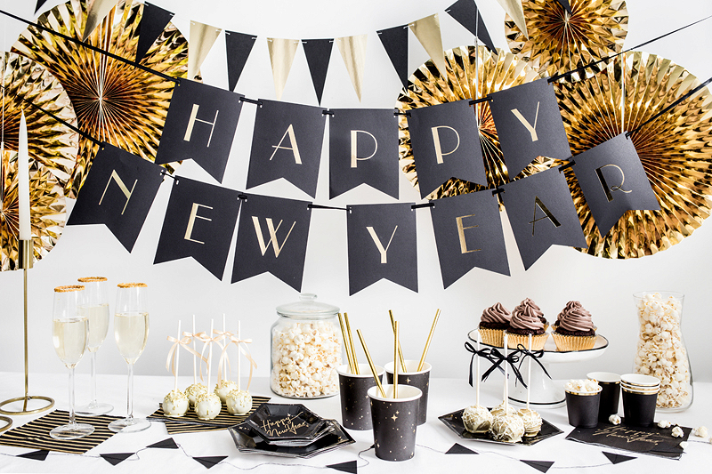 Vlaječková girlanda v mixu zlaté a černé barvy, "udělej si sám" , set obsahuje 14 vlaječek a cca 3 metry zlatého provázku. Velikost po sestavení na výšku cca 13cm a délka cca 2.15 metrů.