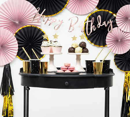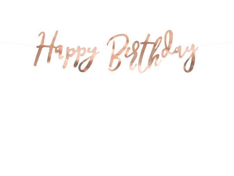 Narozeninový baner s růžovozlatým nápisem "Happy Birthday".