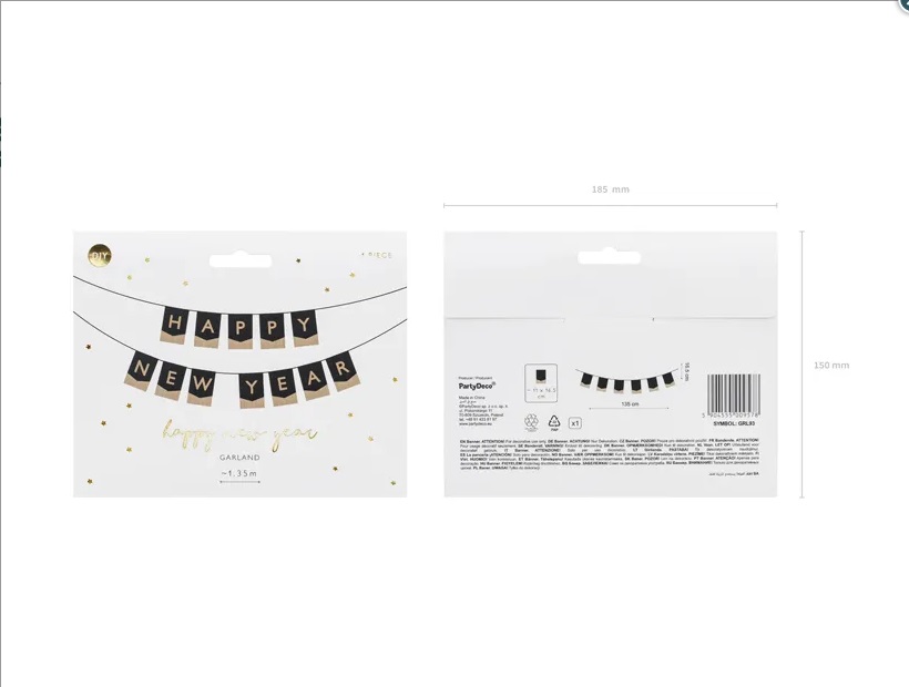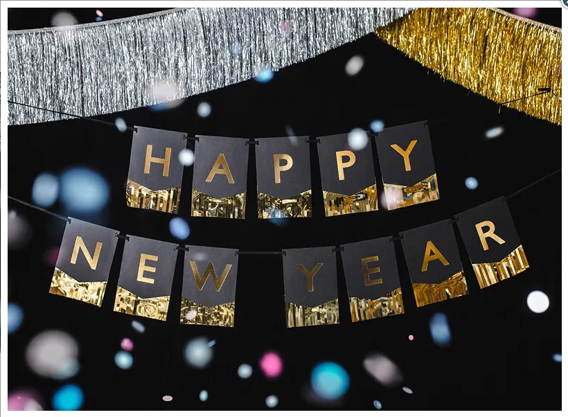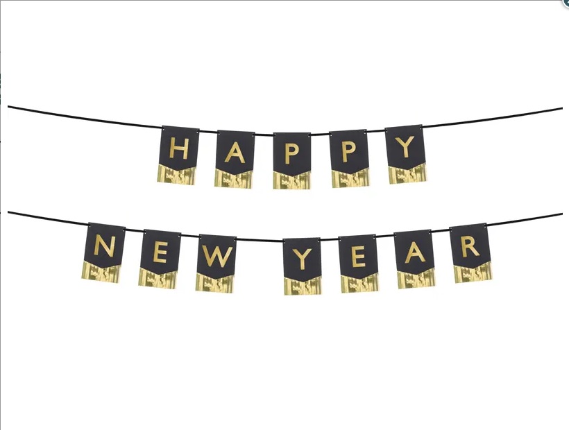 Baner Happy New Year, vyroben z černého papíru se zlatou fólií a zlatým písmem.