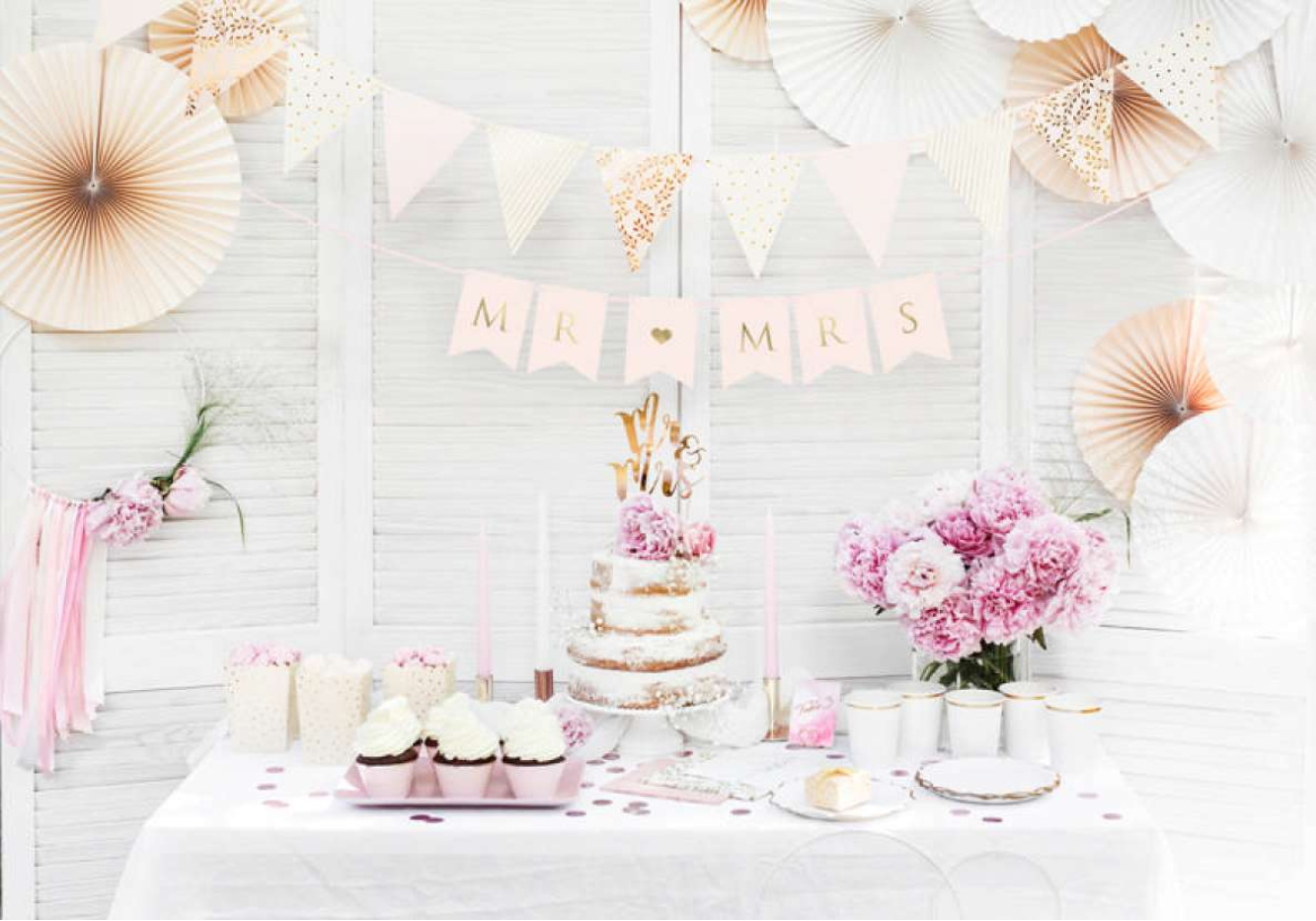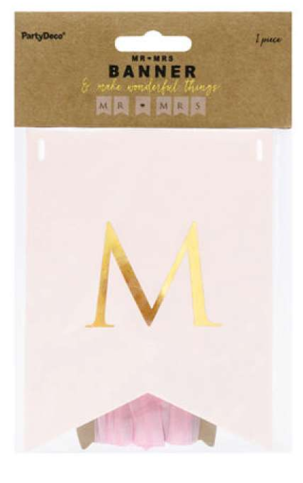 Svatební baner v růžové barvě se zlatými nápisy Mr Mrs.