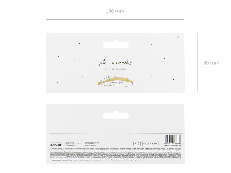 Jmenovky z bílého papíru ve tvaru peříčka se zlatým detailem.