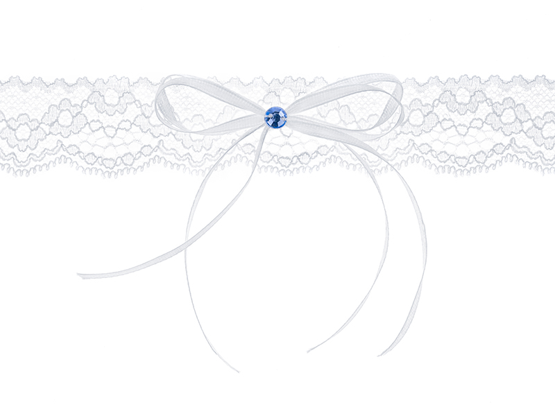 Krajkový podvazek s bílou satinovou stužkou a modrým kamínkem.