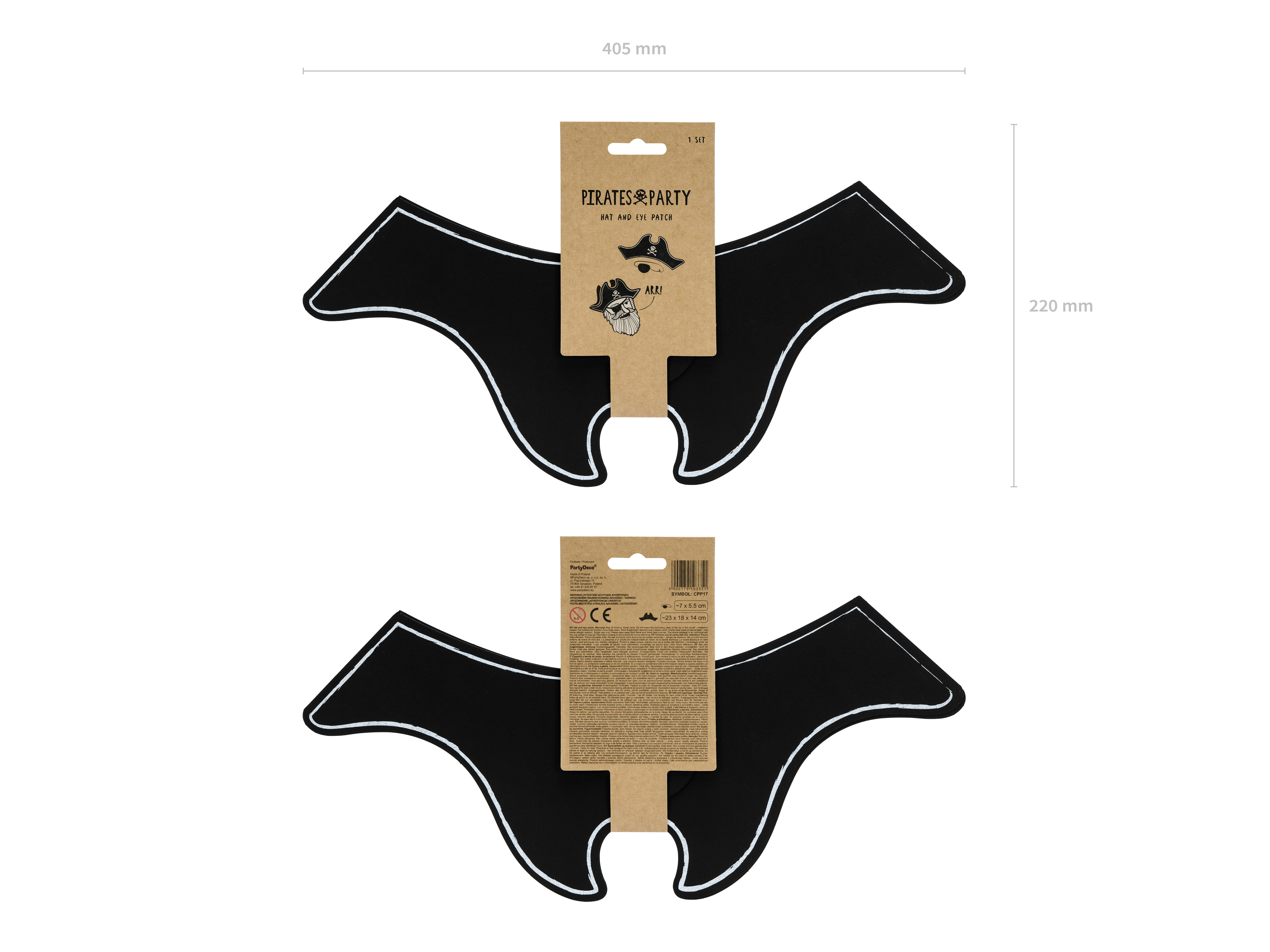 Sada pirátské čepice a pásky přes oko, jsou vytvořeny z černého měkkého papíru s bílým potiskem.