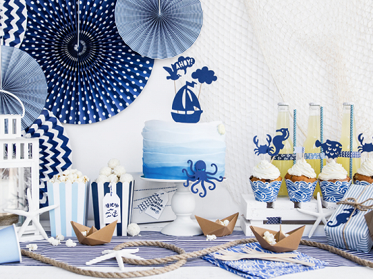 Dekorační rozety v tmavě modré barvě s potiskem.