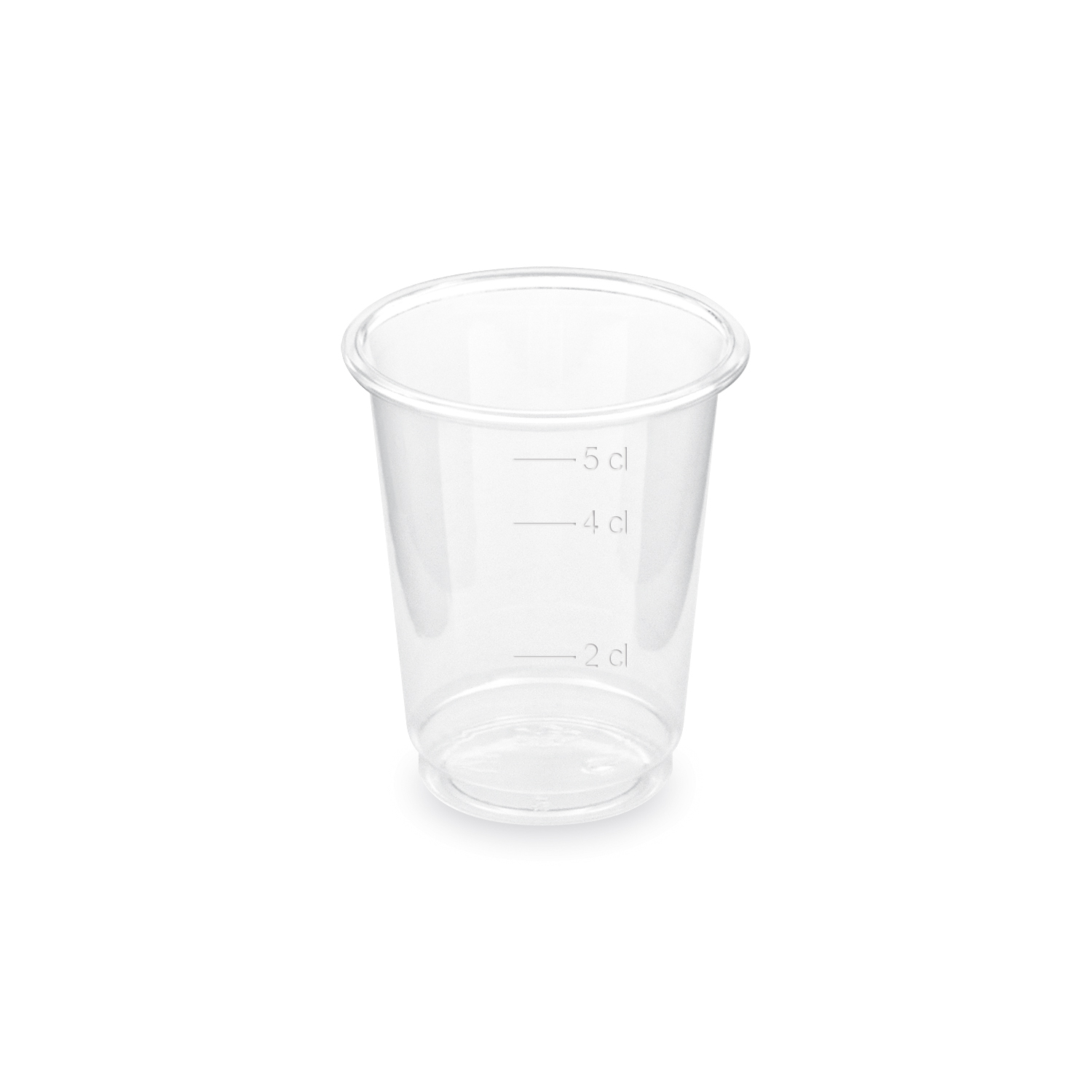 Čirý plastový kelímek na nápoje. Odlivka má 3 cejchy 0,02l (vzdálenost od okraje 30mm), 0,04l (vzdálenost od okraje 16mm)a 0,05l (vzdálenost od okraje 9mm). Rozměry: O dna 35mm, O hrdla 50mm, výška 50mm. Materiál: krystal PS, vysoký lesk a průhlednost, imitace skla.