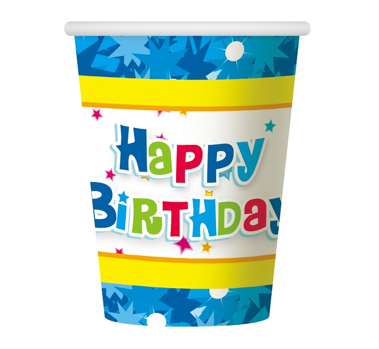Sada šesti ozdobných papírových kelímků s motivem modrých narozenin o objemu 270ml.