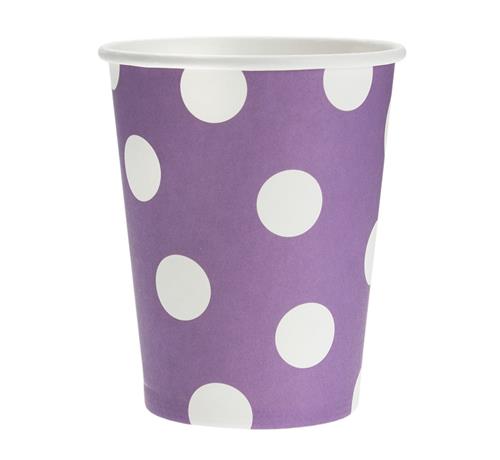 Sada šesti papírových kelímků ve fialové barvě s bílými puntíky o objemu 270ml.