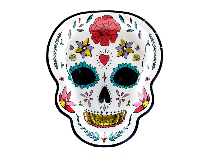 Papírové talíře v podobě barevné masky k oslavě svátku Dia de los Muertos.
