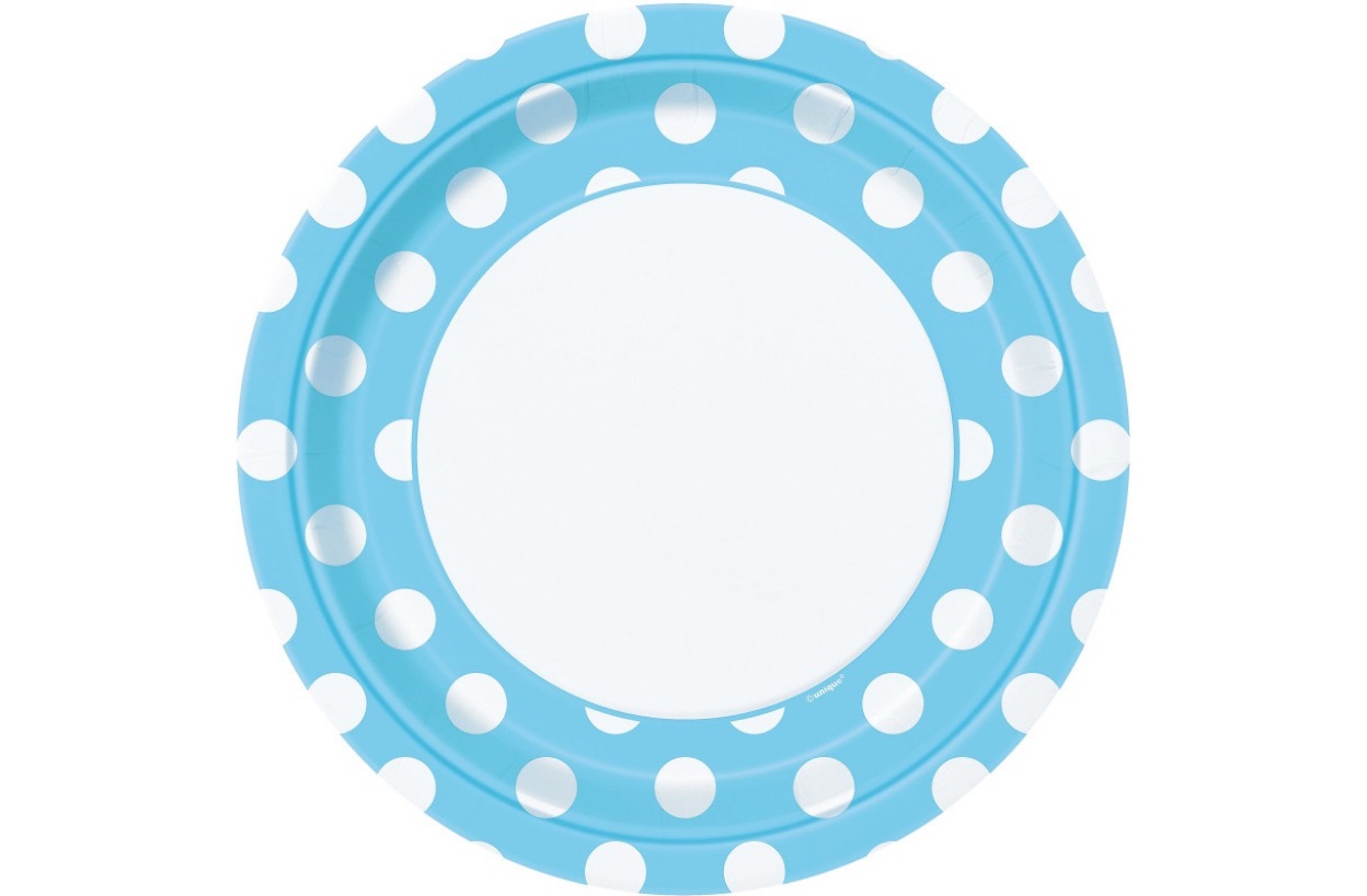 Sada osmi EKO papírových talířků o průměru 23cm v bílé barvě s modrými puntíky.
