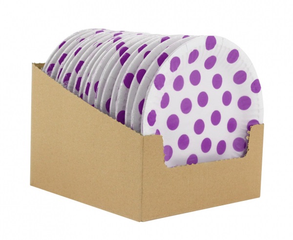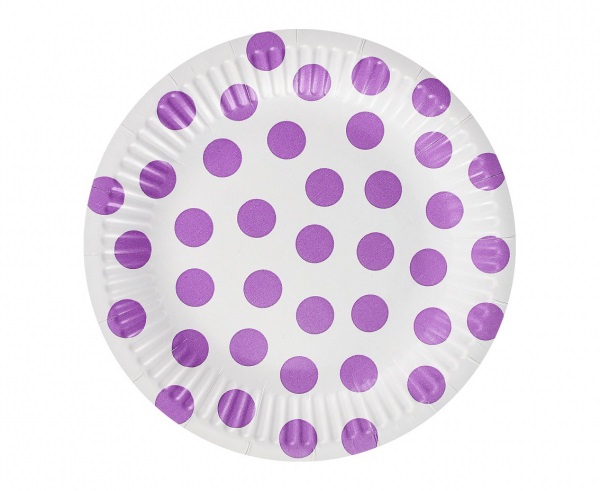 Sada šesti papírových talířků o průměru 18cm v bílé barvě s fialovými puntíky.