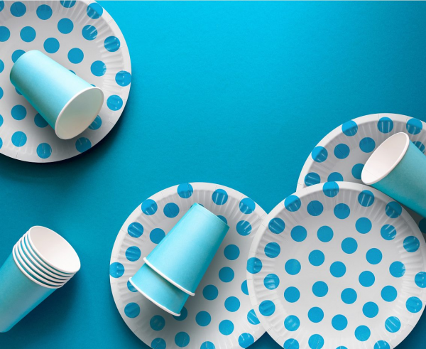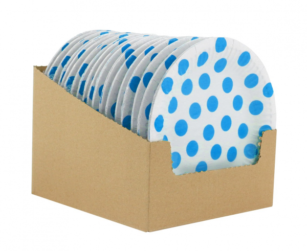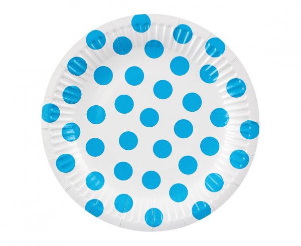 Sada šesti papírových talířků o průměru 18cm v bílé barvě s modrými puntíky.