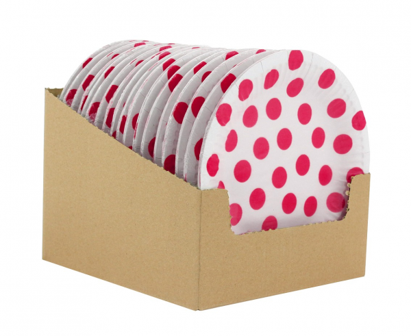 Sada šesti papírových talířků o průměru 18cm v bílé barvě s růžovými puntíky.
