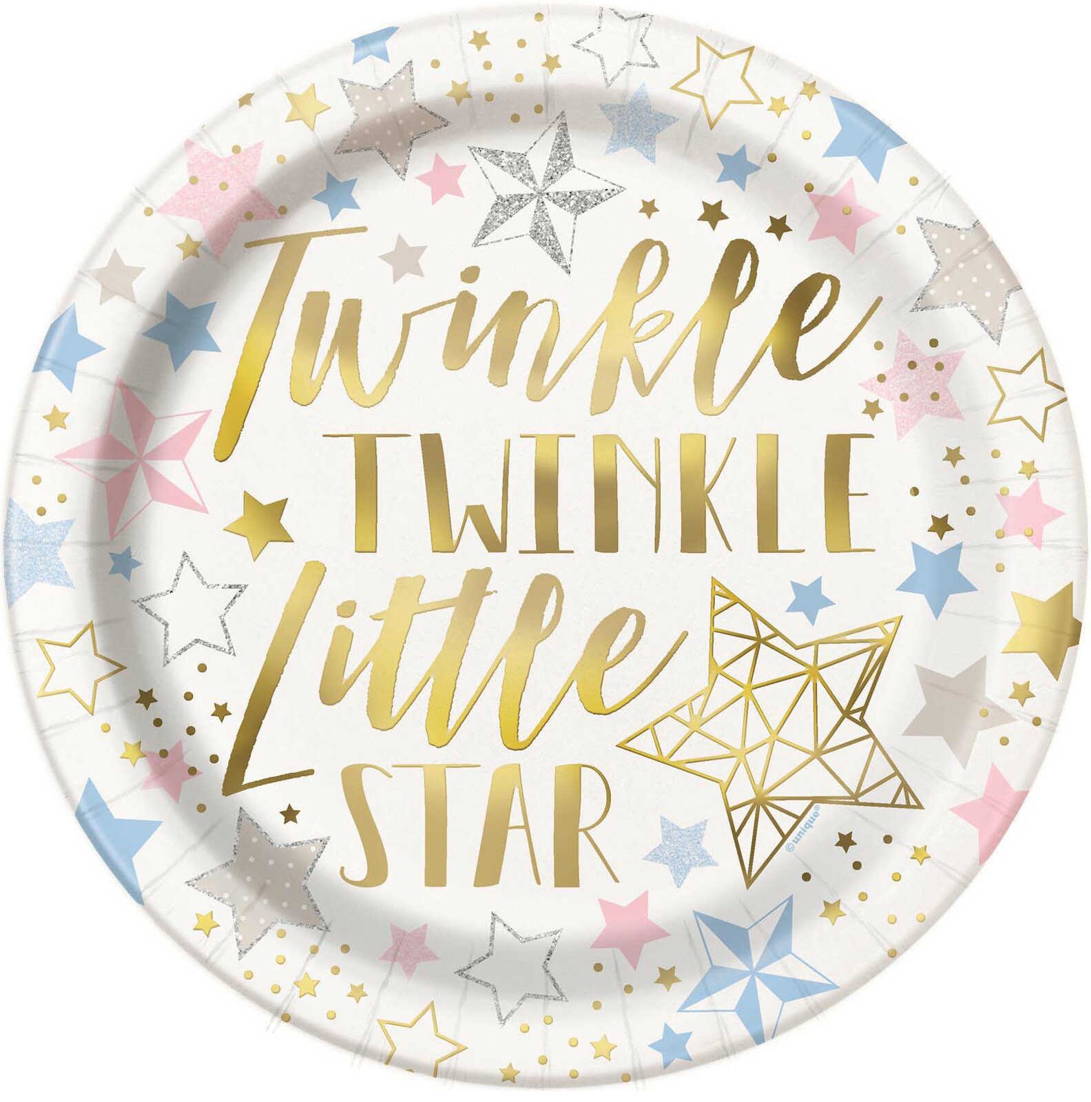 Sada osmi papírových talířků o průměru 23cm v bílé barvě s potiskem barevných hvězd a zlatým nápisem Twinkle, twinkle little star.