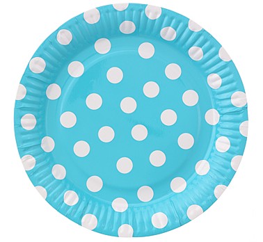 Sada šesti papírových talířků o průměru 23cm v modré barvě s bílými puntíky.