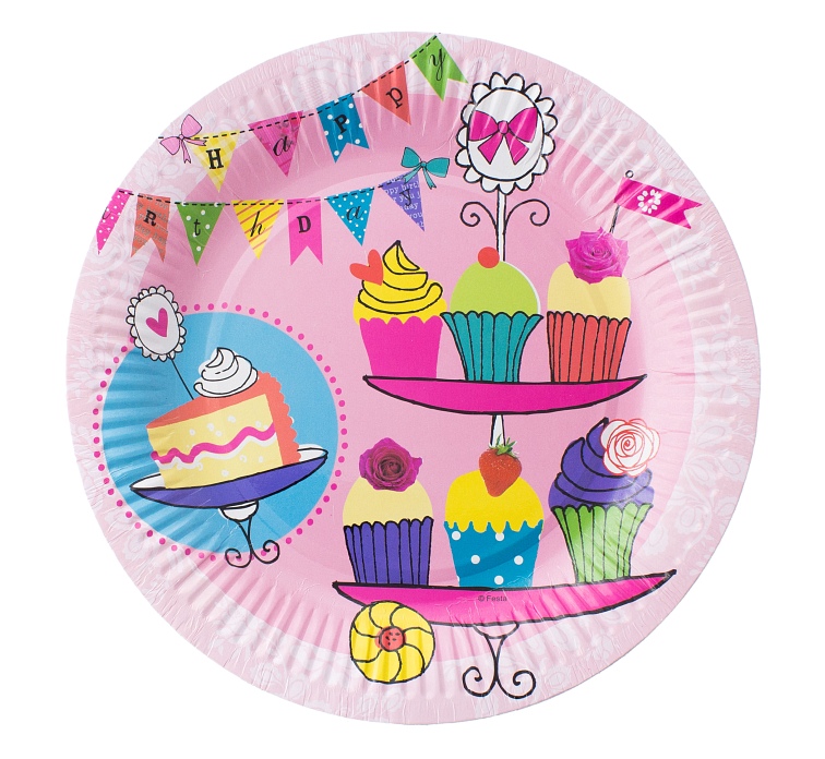 Sada šesti papírových talířků o průměru 18cm s party motivy růžových barev.