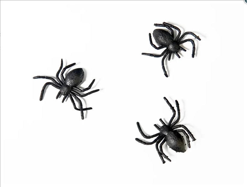 Černí pavouci vyrobeni z plastu pro dokonalou dekoraci Halloweenské oslavy.