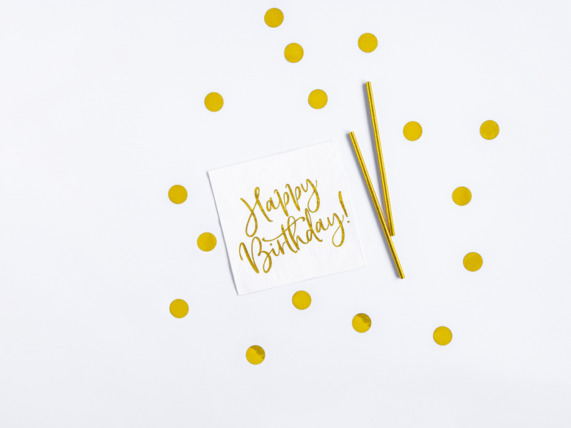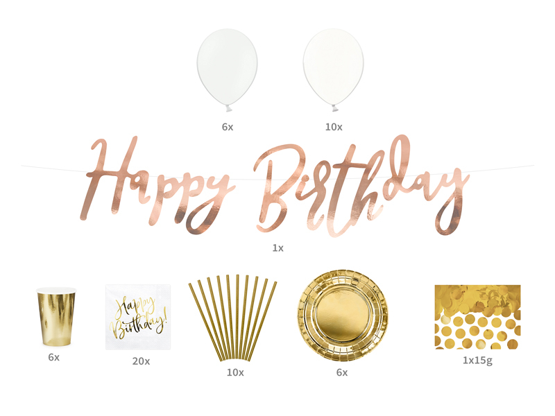Set obsahuje: papírovou girlandu 1ks, latexové balónky v mixu designů 16ks, zlaté kelímky 6ks, papírové ubrousky s potiskem 20ks, brčka 10ks, zlaté talíře 6ks a zlaté konfety (15g).