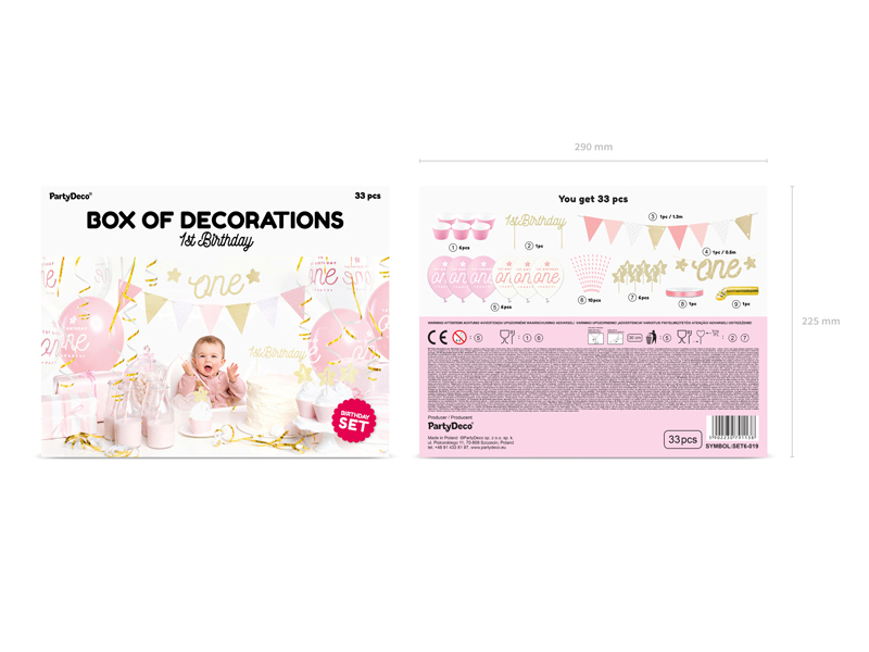 Set obsahuje: baner ONE 1ks, papírová girlanda 1ks, zápichy do cupcakeků 6ks, světle růžové obaly muffinů 6ks, zápich do dort 1ks, brčka 10ks, latexové balónky v mixu designů 6ks, zlatá stužka, světle růžová saténová stuha.