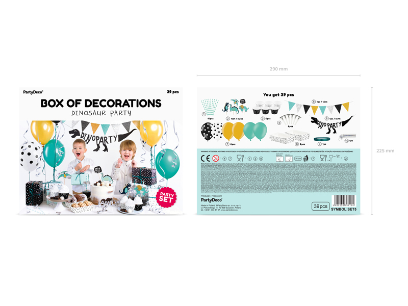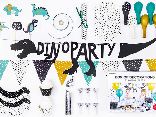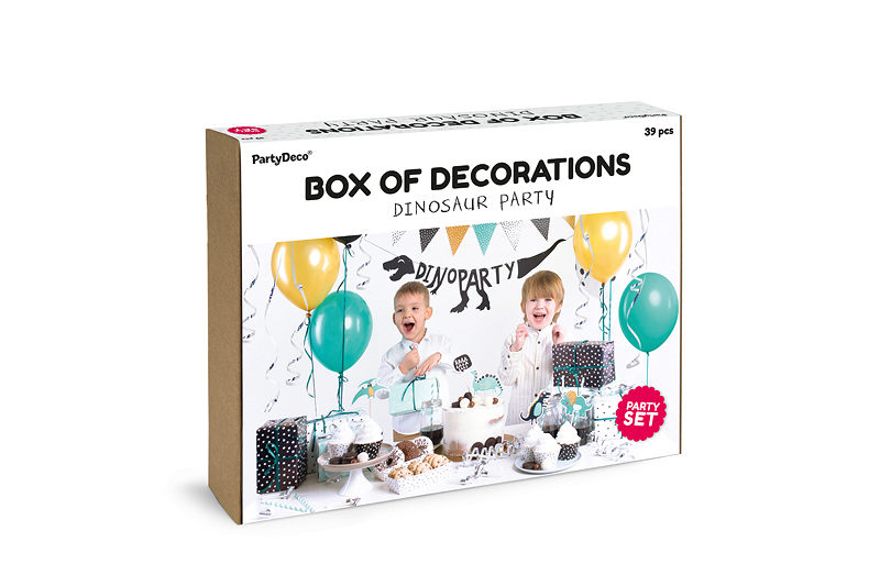 Set obsahuje: baner Dino Party 1ks, papírová girlanda 1ks, obaly na muffiny 6ks, zápichy do dortů 5ks, krabičky na dobroty 2ks, brčka 10ks, stříbrné frkačky 6ks, latexové balónky v mixu designů 6ks, stříbrná stuha, lahvově zelená satinová stuha.