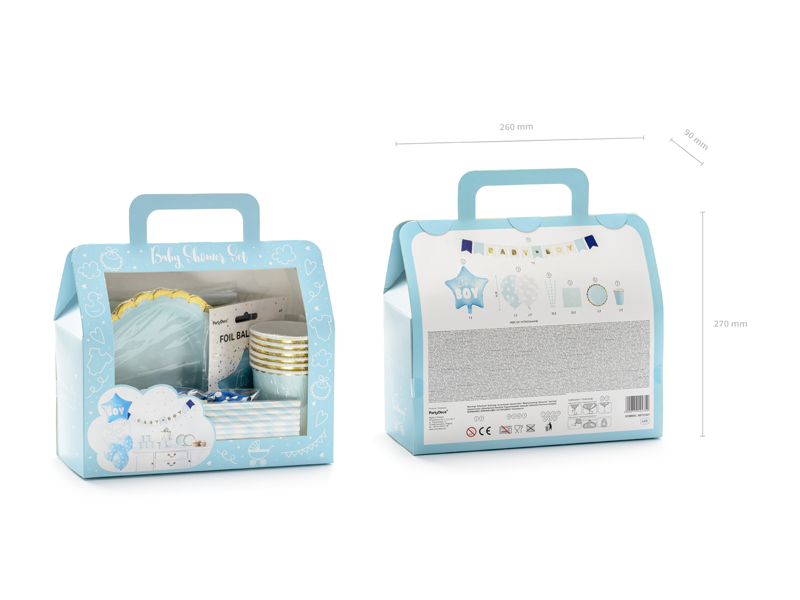 Set obsahuje: baner Baby Boy 1ks, papírové kelímky 6ks, papírové talíře 6ks, papírové brčka 10ks, papírové ubrousky 20ks, foliový balónek 1ks, latexové balónky v mixu designů 5ks.