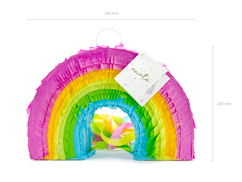 papírového obalu v podobě barevné duhy, ve které jsou ukryty sladkosti.