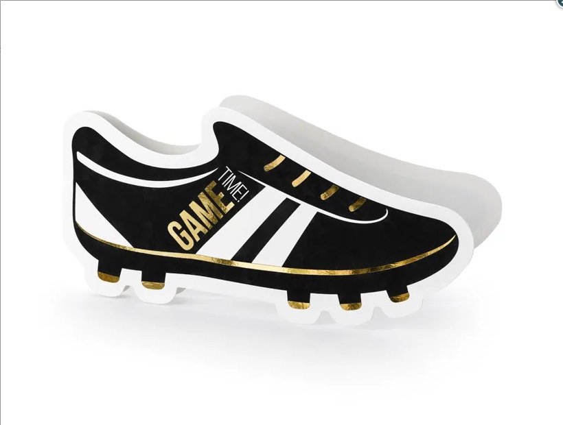Pozvánka ve tvaru kopačky v černé barvě se zlatým a bílým potiskem.