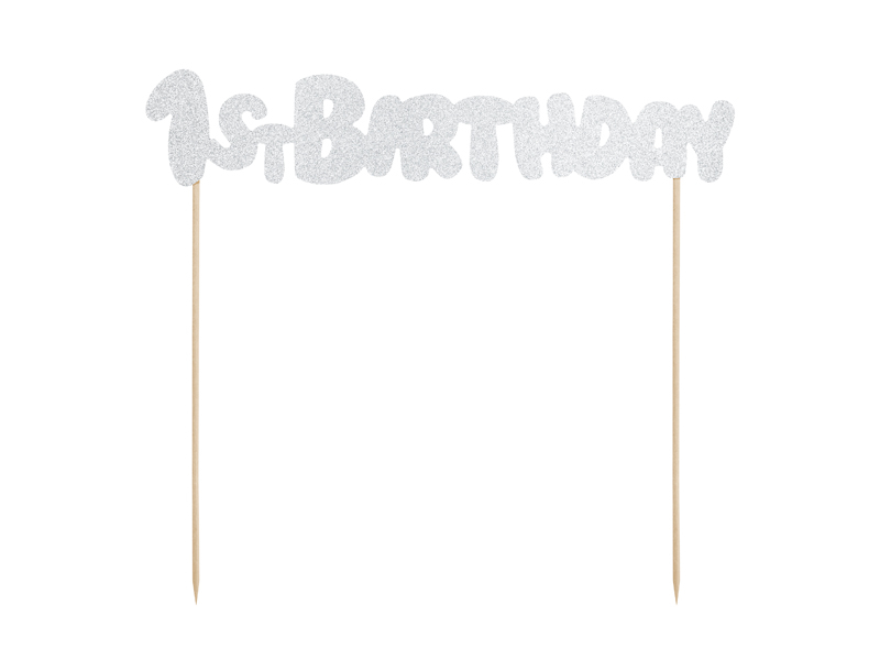 Ozdoba na dort k 1. narozeninám v třpytivé stříbrné barvě, nápis 1st birthday. Výška ozdoby je asi 19.5cm.