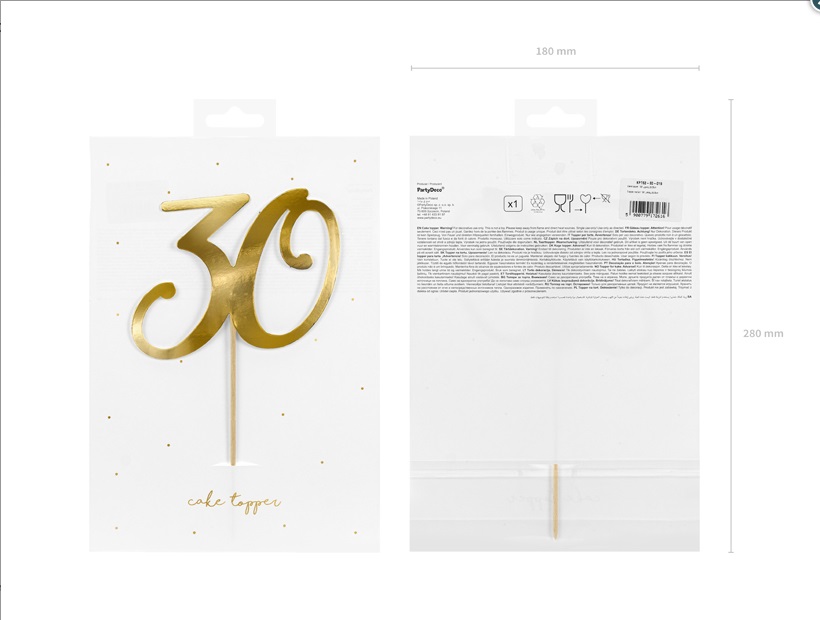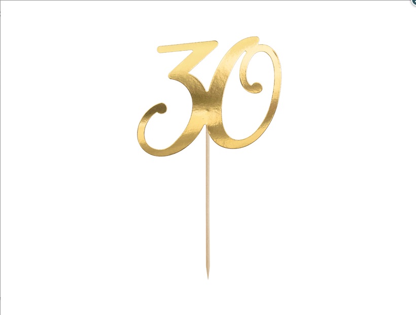 Ozdoba na dort ve tvaru číslic 30 ve zlaté barvě, výška ozdoby je asi 20.5cm.
